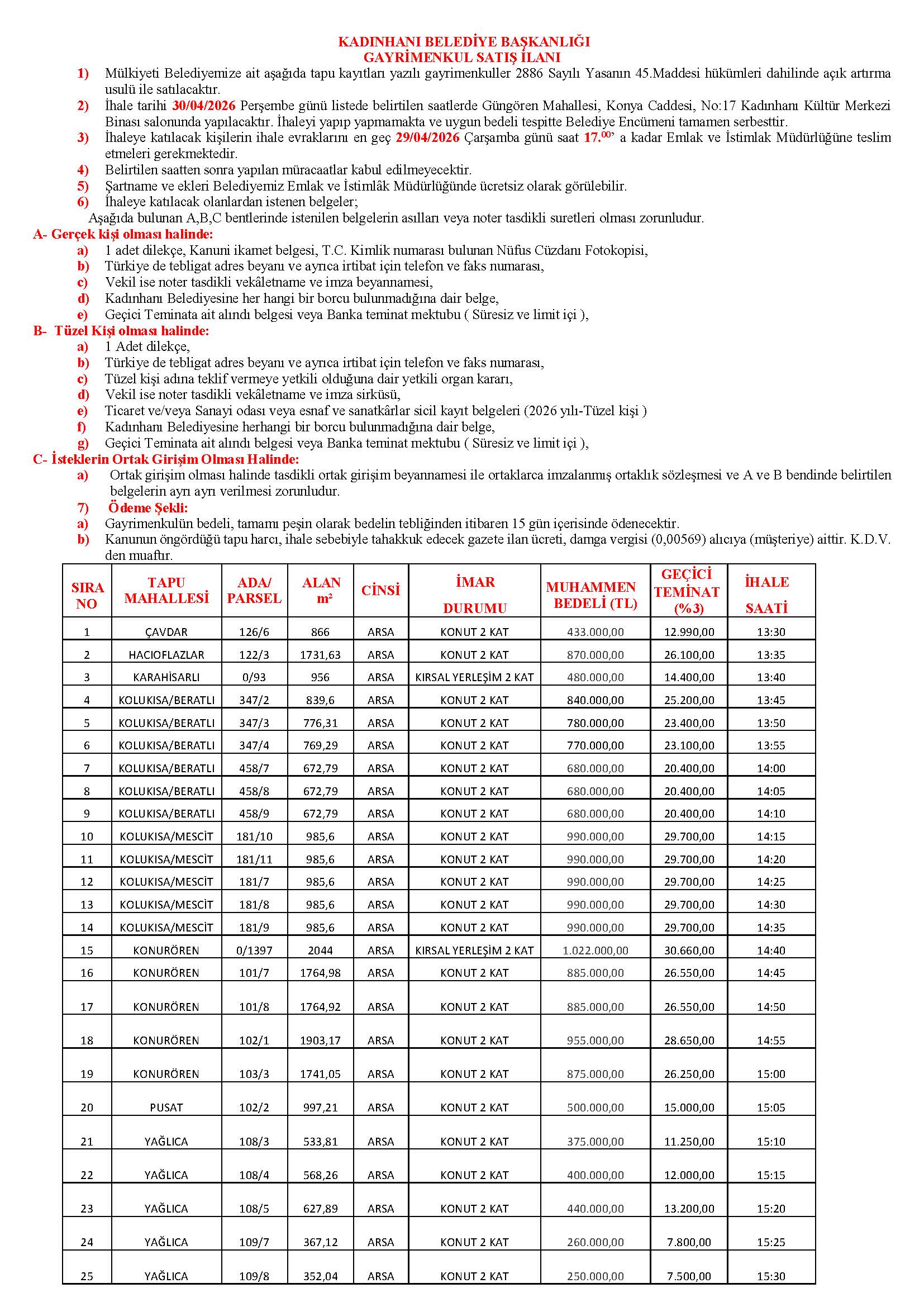 2) İhale tarihi 30/04/2026 Perşembe günü listede belirtilen saatlerde Güngören Mahallesi, Konya Caddesi, No:17 Kadınhanı Kültür Merkezi Binası salonunda yapılacaktır. İhaleyi yapıp yapmamakta ve uygun bedeli tespitte Belediye Encümeni tamamen serbesttir.